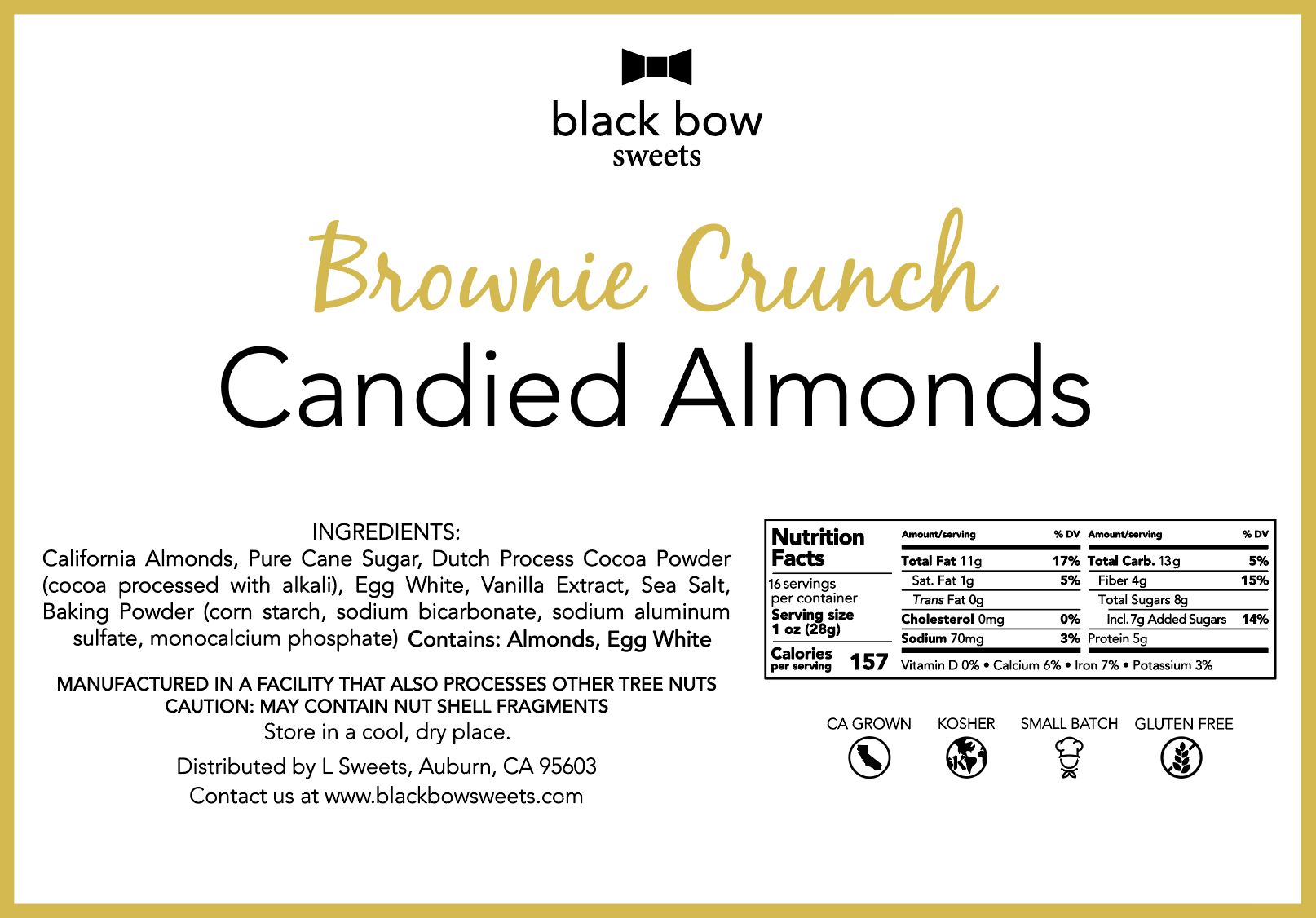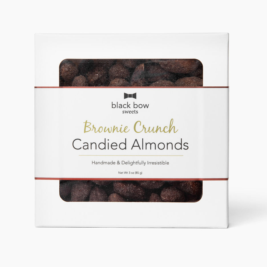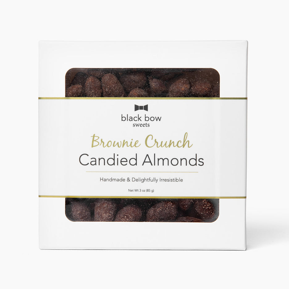 Our NEW Brownie Crunch Candied Almonds are handmade with a rich brownie batter baked into a crunchy shell around a toasted California almond. The perfect crunchy brownie bite for your chocolate cravings! Incredibly delicious on their own and a perfect pair for ice cream, baked goods and dessert boards.