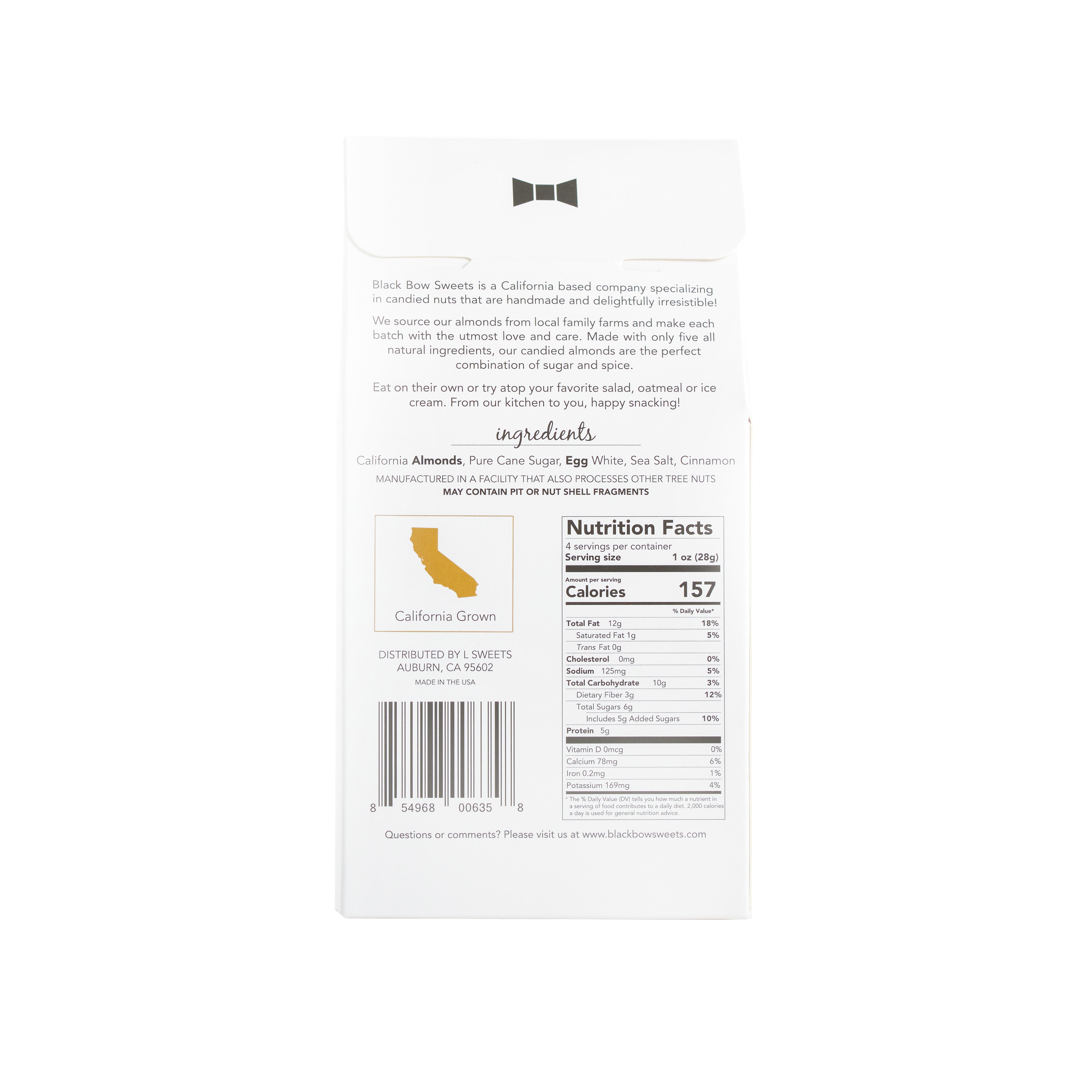 Our candied almonds are handmade with locally sourced California almonds and the perfect mix of cinnamon, sugar and a hint of sea salt. This delightful everyday snack is perfect to keep on hand at home for those mid-day cravings. Enjoy on their own or use on top of salads, oatmeal, ice cream or as an addition to your favorite cheese plate.