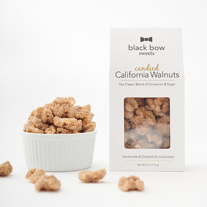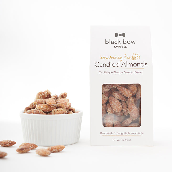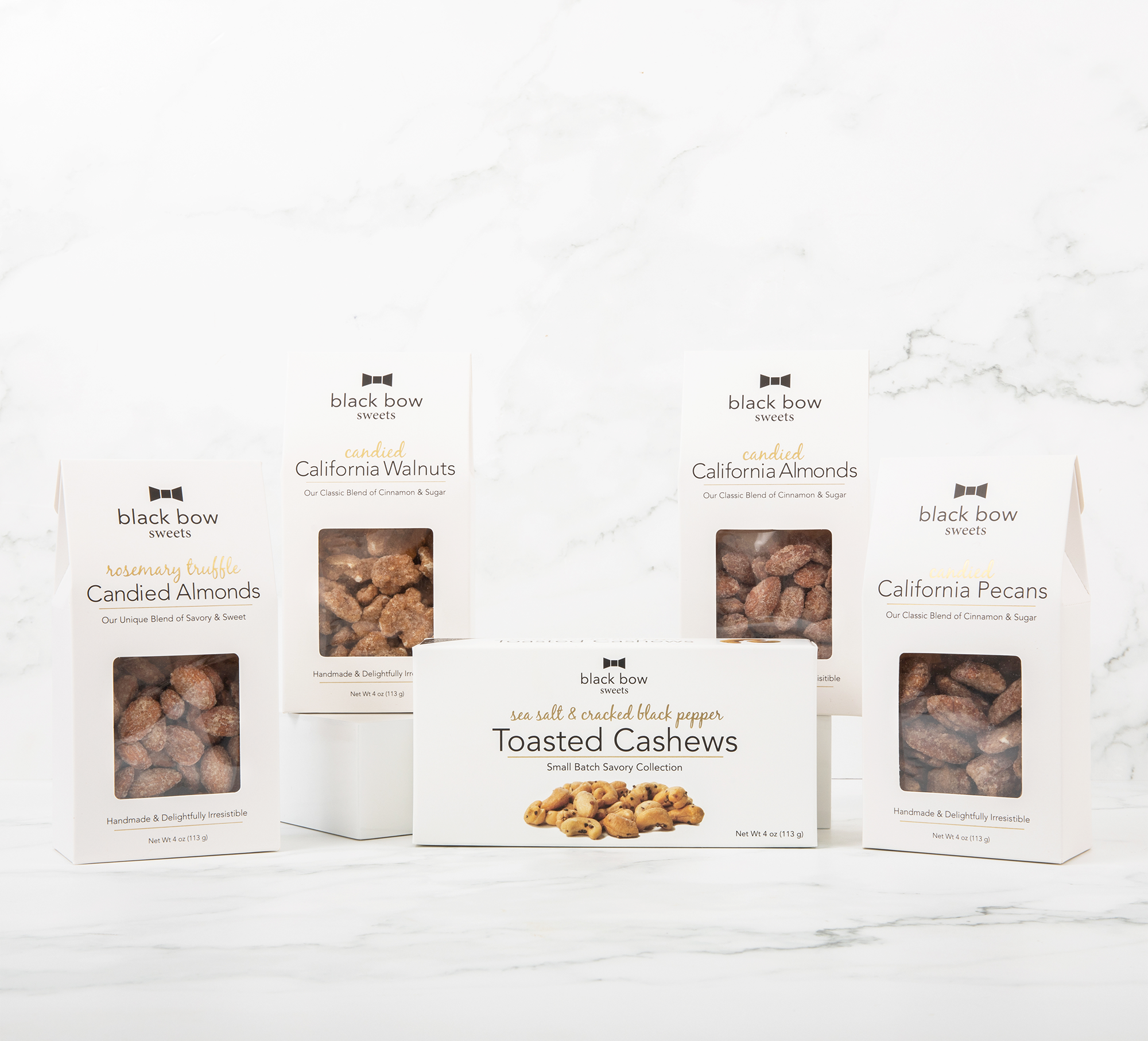 Looking to try a variety? This set includes (5) 4 oz gourmet boxes of our signature Candied Pecans, Candied Walnuts, Candied Almonds, Rosemary Truffle Candied Almonds and savory Sea Salt and Black Pepper Cashews. All nuts are handmade in small batches. Each recipe has only 5 all natural ingredients and contains no gluten, soy, dairy, preservatives or additives.