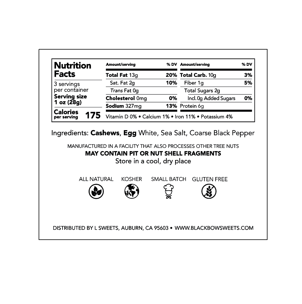 Handmade and toasted to perfection with a classic blend of sea salt and coarse black pepper, these cashews are sure to become your new favorite snack! Perfect to satisfy your savory cravings while keeping you satiated with healthy fats and protein.